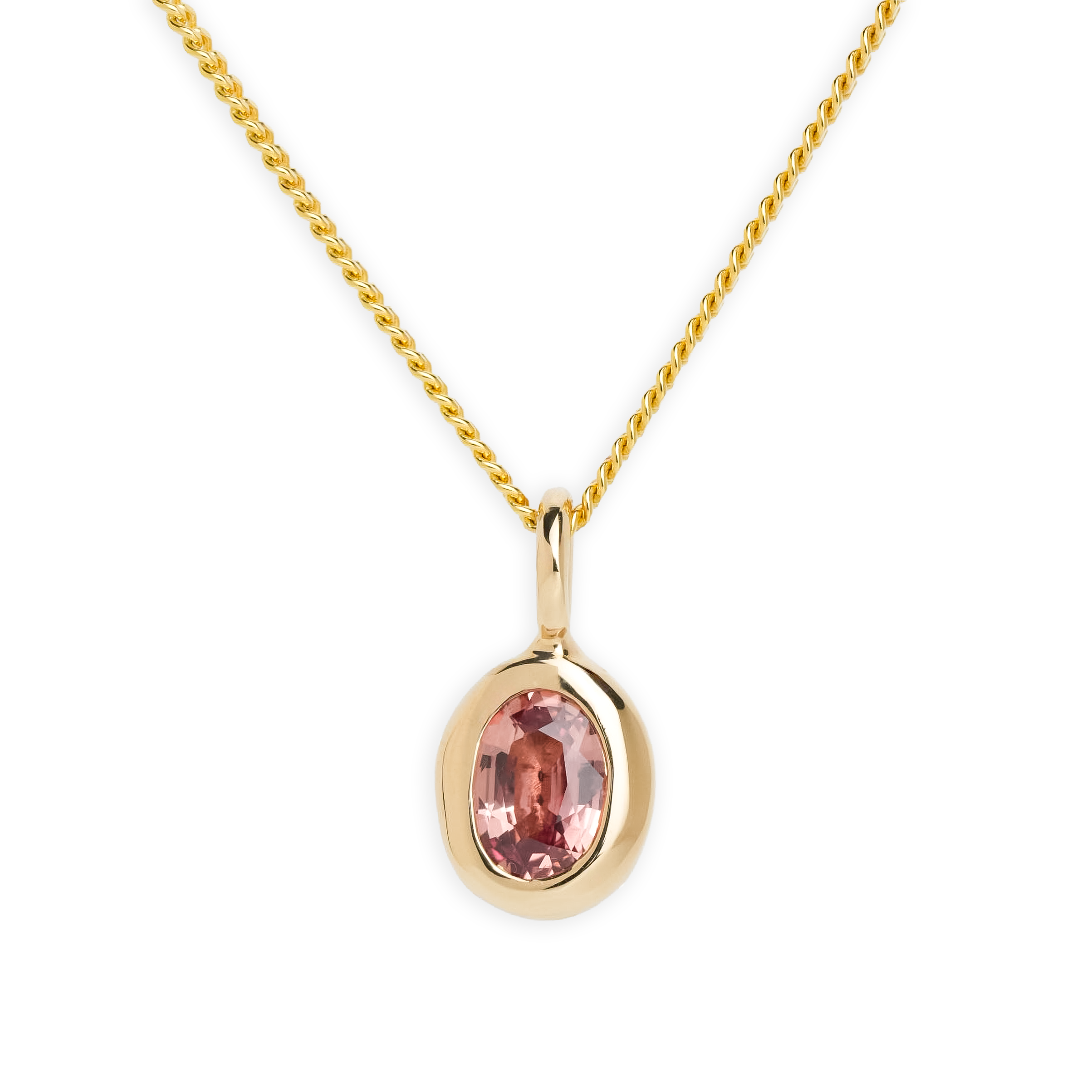 0.85ct peach oval sapphire set in a hand carved solid domed 14k yellow gold setting. Adding a little sparkle to your stack.